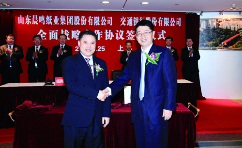 9月25日下午,晨鳴集團與交通銀行全面戰略合作協議簽約儀式在上海交通銀行總行隆重舉行。晨鳴集團董事長陳洪國、交通銀行行長彭純等出席簽約儀式,晨鳴集團財務總監王春方、交通銀行公司業務總監呂本獻分別在協議書上簽字。晨鳴集團董事長陳洪國與交通銀行副行長錢文揮分別致辭。